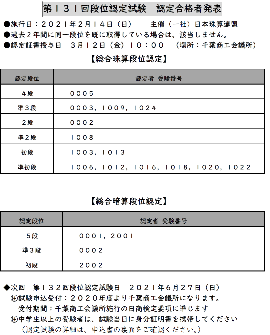 第131回段位認定試験 認定合格者発表